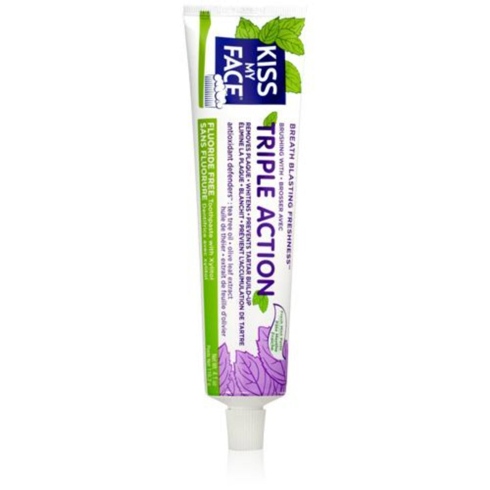 Enjoy Kiss My Face Toothpaste - Triple Action - Fluoride Free - Paste - 4.5 oz every day at these amazing prices! One Kiss will give you Breath Blasting Freshness with great Peppermint taste. Our Triple Action Formula helps: Remove plaque with Xylitol and Tea Tree Whitens with Icelandic Moss Prevent tartar build up with Zinc Citrate Hey Kissers, give us a smile! With shockingly great taste, our effective formula helps your mouth feel healthy and fresh with Antioxidant Defenders and nature's most trusted ingredients: Tea Tree Oil, Iceland Moss, Olive Leaf Extract, Xylitol, Silica, Peppermint. Now with 20% more so you can keep kissing longer... One Kiss is all it Takes! Gluten free ingredients No Parabens No Phthalates No SLS Vegan Friendly Ingredients Not Animal Tested No Artificial Flavors No Artificial Fragrances Product characteristics include: Vegetable Glycerin, Water, Hydrated Silica, Sorbitol, Xylitol, Calcium Carbonate, Olea Europaea (Olive) Leaf Extract, Cetraria Islandica (Iceland Moss) Extract, Melaleuca Alternifolia (Tea Tree) Leaf Oil, Stevia Rebaudiana Extract, Natural Flavor, Xanthan Gum, Sodium Methyl Cocoyl Taurate, Sodium Lauroyl Sarcosinate, Titanium Dioxide, Zinc Citrate, Potassium Sorbate. (Please note: Description is informational only. Always read the product label before use and check with your health professional before using this product)4.1 OZ